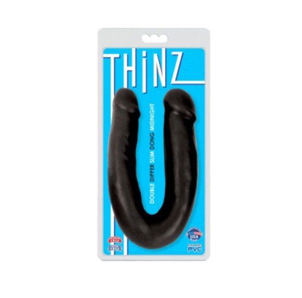 Dildo "ThinZ" doble Dildo realista firme y plegable para mayor confort y placer. Diseñado para doble penetración. Diseñado a mano, ergonómico. Material: PVC libre de ftalatos y látex. Fácil de limpiar. Medidas: 3,5x34 cm. Color: negro