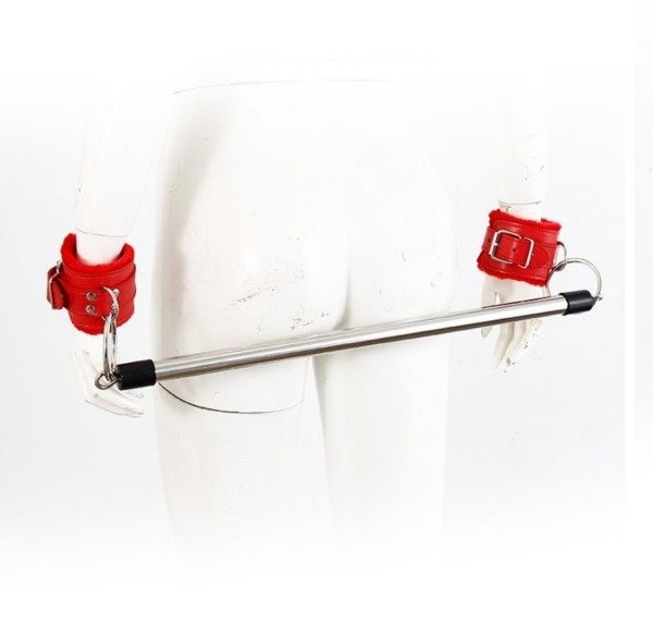 "BARRAL INMOVILIZADOR" Se utiliza con esposas con mosquetón, e impide, para la persona que lo usa, cerrar los brazos o las piernas (según dónde se utilice). Medidas: 60x2 cm. metal, ecocuero y felpa. Color: negro y rojo.