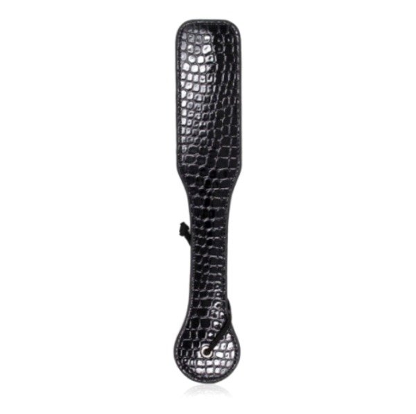 "PALMETA BLACK" de ecocuero símil charol con mango y tira de agarre para muñeca. Poderosa y espectacular. Medidas: 32,1x6 cm. Color: negro.