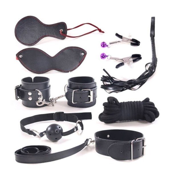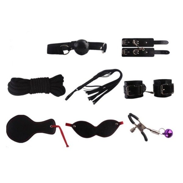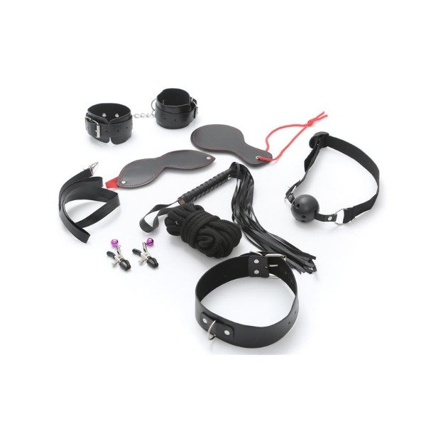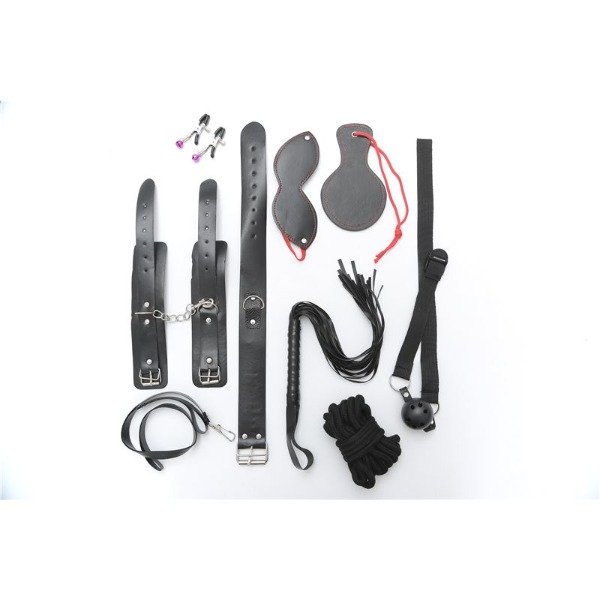 Incluye: Látigo, pinzas de pezón, palmeta, collar con correa, soga, esposas muñequeras, antifaz y mordaza.