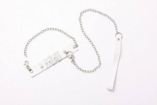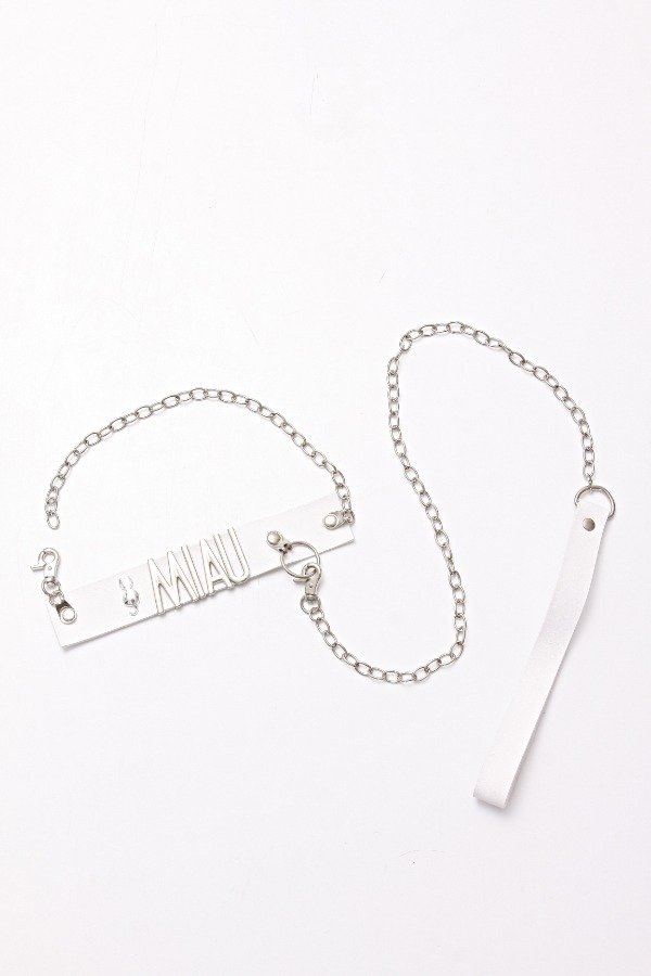Material: ecocuero. Medidas: cadena de 75 cm, collar de hasta 50 cm. Color: blanco y metal.