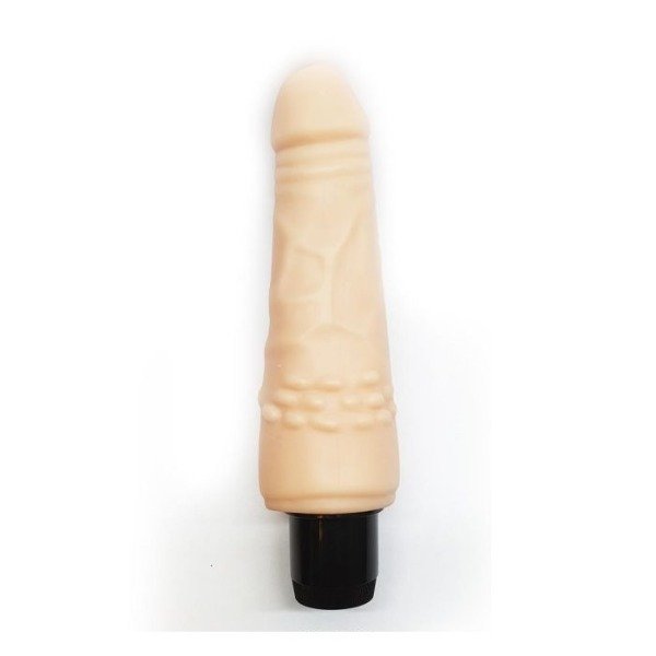 Potente vibrador de textura realística con diseño diferente que estimula clítoris en su base para una experiencia más placentera con esos puntos en relieve que muestra la foto.